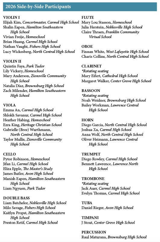 Join the Side-by-Side participants as they perform alongside Indianapolis Symphony Orchestra musicians after four weeks of intensive coaching! This is a family-friendly concert.Featuring the winner of the Michael Ben and Illene Komisarow Maurer Young Musicians Competition, violinist Catelijne Hunt. Click here to view the listing of the 2026 Side-by-Side participants.
